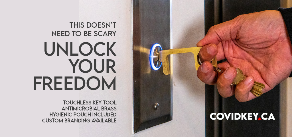 COVIDKEY – An antimicrobial Brass tool designed to alleviate the need for contact in many common day touch-point interactions. COVIDKEY acts as a door opener, button pusher and stylus to manage touch-screens and makes for the perfect brand marketing tool empowering Brokerages and Agents to provide a quality, custom branded keepsake to show your commitment to relevant, innovative solutions that compliments the property’s new set of keys!